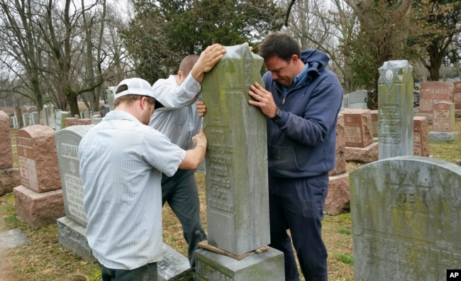 Para Pekerja mengangkat kepala batu makam di Pemakaman Chesed Shel Emeth di University City, Mo., sebanyak 150 kepala batu makam dalam posisi sengaja dimiringkan. Usaha ini didukung oleh banyak relawan dari berbagai agama.